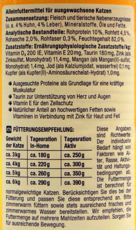 Fütterungsempfehlung: Gewicht der Katze/ Tagesration Aktiv/ In-Home: ca.3kg/ ca.180g/ ca.250g; ca.4kg/ ca.220g/ ca.300g; ca.5kg/ ca.260g/ ca.350g; ca.6kg/ ca. 290g/ ca. 390g. Diese Angaben sind Richtwerte. Der individuelle Bedarf hängt von Faktoren wie Alter, Rasse, Aktivität und Haltungsbedingungen ab. Die Futtermenge ist berechnet für normalgewichtige Katzen. Berücksichtigen Sie dies bei der Fütterung und passen Sie diese entsprechend an. Bitte zimmerwarm füttern, stets ausreichend frisches und zimmerwarmes Wasser bereitstellen und für ausreichende Bewegung sorgen.
