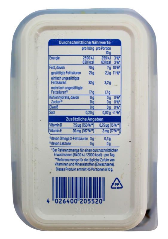43 % Rapsöl, Trinkwasser, pflanzliche Öle (Sonnenblumenöl ganz gehärtet, Sonnenblumenöl), Kokosfett, Emulgatoren (Lecithine, Mono- und