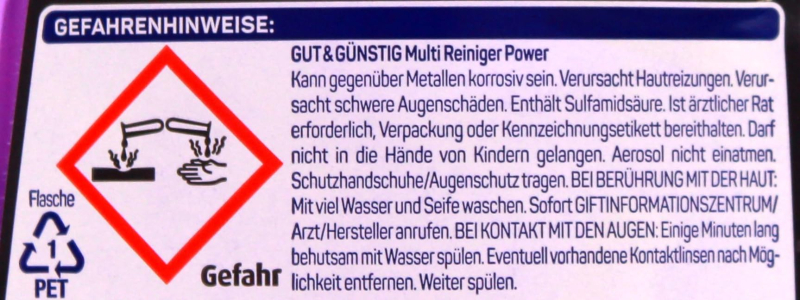 GEFAHRENHINWEISE: Gut & Günstig Multireiniger Power kann gegenüber Metallen korrosiv sein. Verursacht Hautreizungen. Verursacht schwere Augenschäden, Ethält Sulfamidsäure. Ist ärztlicher Rat erforderlich, Verpackung oder Kennzeichnungsetikett bereithalten. Darf nicht in die Hände von Kindern Gelangen. Aerosol nicht einatmen.Schutzhandschuhe/Augenschutztragen. BEI BERÜHRUNG MIT DER HAUT:Mit viel Wasser und Seife waschen. Sofort GIFTINFORMATIONSZENTRUM/ARZT/HERSTELLER anrufen. BEI KONTAKT MIT DEN AUGEN: Einige Minuten lang behutsam mit Wasser spülen. Eventuell vorhandene Kontaktlinsen nach Möglichkeit entfernen. Weiter spülen.