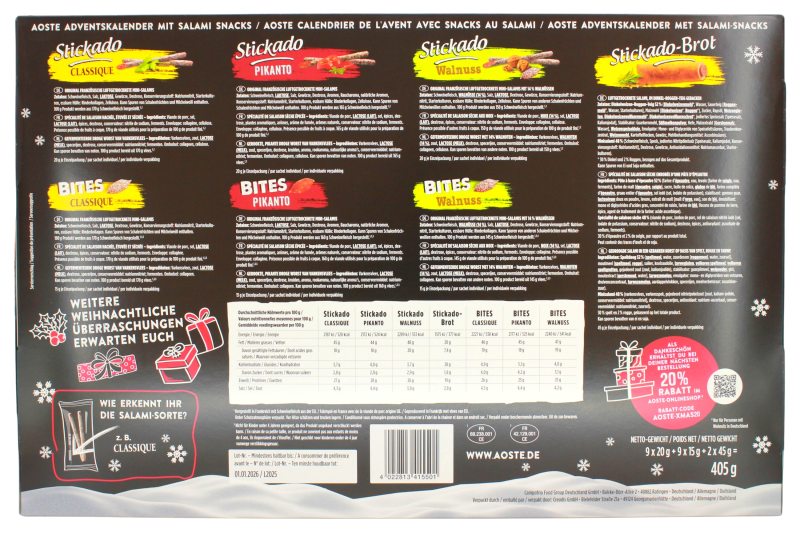 - Aoste Adventskalender: 9 x Aoste Stickado, 9 x Aoste Bites und 2 x Aoste Stickado-Brot.