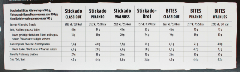 - In den Geschmacksrichtungen: Stickato Classique, Pikanto und Walnuss, Bites Classique, Pikanto und Walnuss und Stickado-Brot.