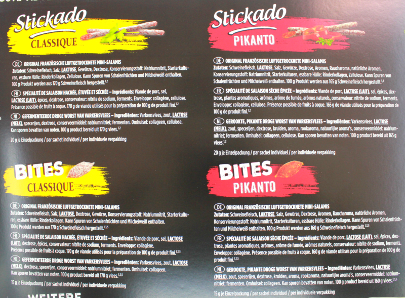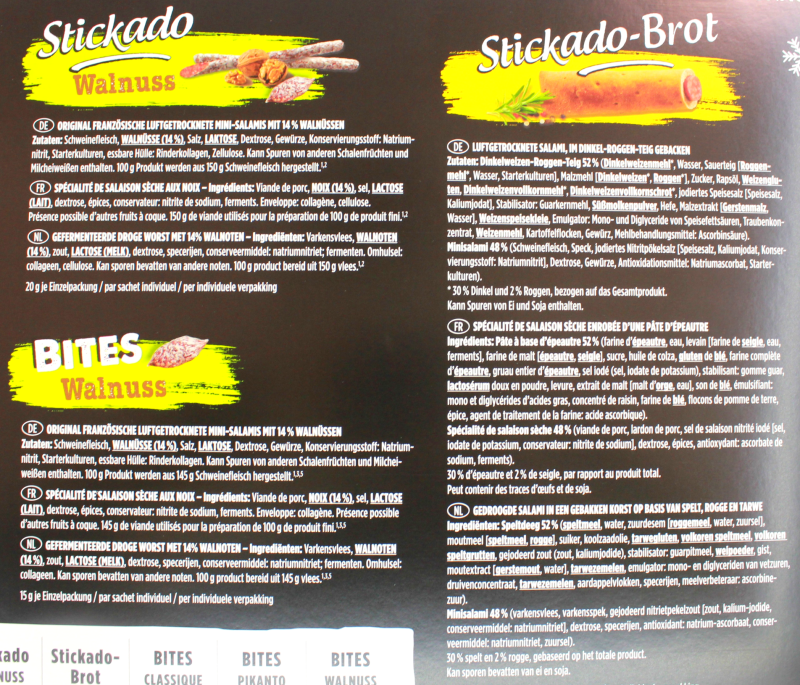 Zutaten Stickado Classique: Schweinefleisch, Salz, LAKTOSE, Dextrose, Gewürze, Antioxidationsmittel: Ascorbinsäure, Rosmarinextrakt; Konservierungsstoff: Natriumnitrit; Starterkulturen. Essbare Hülle: Natriumalginat, Zellulose, Rinderkollagen. Kann Spuren von Schalenfrüchten und Milcheiweißen enthalten. 100 g Salami werden aus 180 g Schweinefleisch hergestellt. Zutaten Stickado Pikanto: Schweinefleisch, LAKTOSE, Salz, Chilipulver (3%), Dextrose, Gewürze, Aromen, Raucharoma, natürliche Aromen, Konservierungsstoff: Natriumnitrit, Starterkulturen, essbare Hülle: Rinderkollagen, Zellulose. Kann Spuren von Schalenfrüchten und Milcheiweiß enthalten. 100 g Salami werden aus 165 g Schweinefleisch hergestellt. Zutaten Stickado Walnuss: Schweinefleisch, WALNÜSSE (14%), Salz, LAKTOSE, Dextrose, Gewürze, Konservierungsstoff: Natriumnitrit, Starterkulturen, essbare Hülle: Rinderkollagen, Zellulose. Kann Spuren von anderen Schalenfrüchten und Milcheiweiß enthalten. 100 g Salami werden aus 145 g Schweinefleisch hergestellt. Zutaten Stickado Brot: Dinkelweizen-Roggen-Teig 52% (DINKELWEIZENMEHL, Wasser, Sauerteig [ROGGENMEHL, Wasser, Starterkulturen], Malzmehl [DINKELWEIZEN, ROGGEN], Zucker, Rapsöl, WEIZENGLUTEN, DINKELWEIZENVOLLKORNMEHL, DINKELWEIZENVOLLKORNSCHROT, jodiertes Speisesalz (Speisesalz, Kaliumjodat), Stabilisator: Guarkernmehl, Süßmolkenpulver, Hefe, Malzextrakt [Gerstenmalz, Wasser], WEIZENSPEISEKLEIE, Emulgator: Mono- und Diglyceride von Speisefettsäuren, Traubenkonzentrat, WEIZENMEHL, Kartoffelflocken, Gewürz, Mehlbehandlungsmittel: Ascorbinsäure). Minisalami 48% (Schweinefleisch, Speck, jodiertes Nitritpökelsalz [Kochsalz, Kaliumjodat, Konservierungsstoff: Natriumnitrit], Dextrose, Gewürze, Antioxidationsmittel: Natriumascorbat, Starterkulturen) 30% DINKEL und 2 % ROGGEN bezogen auf das Gesamtprodukt Zutaten Bites Classique: Schweinefleisch, Salz, LAKTOSE, Dextrose, Gewürze, Antioxidationsmittel: Ascorbinsäure, Rosmarinextrakt; Konservierungsstoff: Natriumnitrit; Starterkulturen. Essbare Hülle: Natriumalginat, Zellulose, Rinderkollagen. Kann Spuren von Schalenfrüchten und Milcheiweißen enthalten. 100 g Salami werden aus 180 g Schweinefleisch hergestellt. Zutaten Bites Pikanto: : Schweinefleisch, LAKTOSE, Salz, Gewürze, Dextrose, Kräuter, Aromen, Raucharoma, Konservierungsstoffe: Natriumnitrit, Starterkulturen, essbare Hülle aus Collagen. Kann Spuren von Nüssen enthalten. 100g Salami werden hergestellt aus 160g Schweinefleisch. Hergestellt in Frankreich mit Schweinefleisch aus der EU. Zutaten Bites Walnuss: Schweinefleisch, WALNÜSSE(14%), Salz, LAKTOSE, Gewürze, Dextrose, Gewürze, Konservierungsstoffe: Natriumnitrit, Starterkulturen, essbare Hülle aus Collagen. Kann Spuren von Nüssen enthalten. 100g Salami werden hergestellt aus 145g Schweinefleisch. Hergestellt in Frankreich mit Schweinefleisch aus der EU.