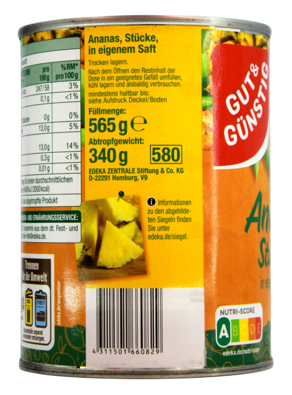 Gut & Günstig Ananas-Stücke in eigenem Saft, 6 x 340g Dose